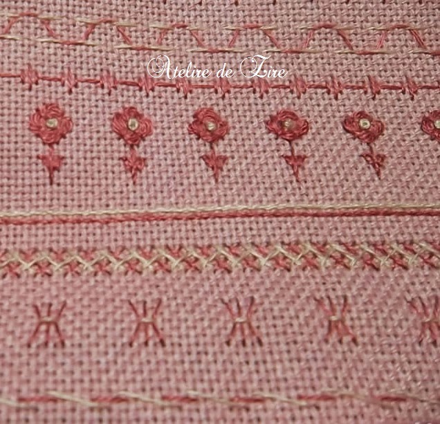 En el esquema de Marie que os he puesto al principio el nº 6, ella ha hecho dos filas en punto avant https://www.youtube.com/watch?v=A3NqY_GNuf8 cogiendo 4 hilos y dejando dos de separación, en la segunda fila ha dejado una distancia entre la primera de 6 hilos o filas para abajo. En mi caso como la tela es lisa y no lleva dibujo de lineas como la de Marie la he cambiado por dos filas seguidas de punto tige. Una en cada color y cogiendo dos hilos cada vez.